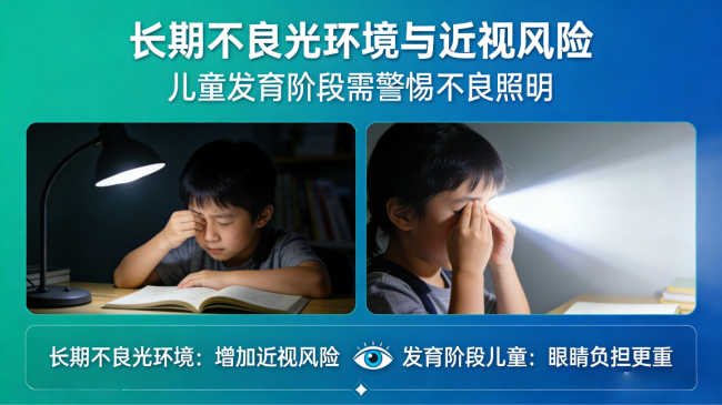 3、长期不良光环境,会增加近视风险:尤其是孩子在发育阶段,不良照明环境更容易加重眼睛负担。