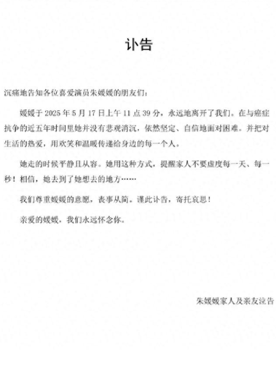 2025年5月17日,演艺圈突降噩耗。国家话剧院一级演员朱媛媛因癌症医治无效,于上午11时39分与世长辞,享年51岁。