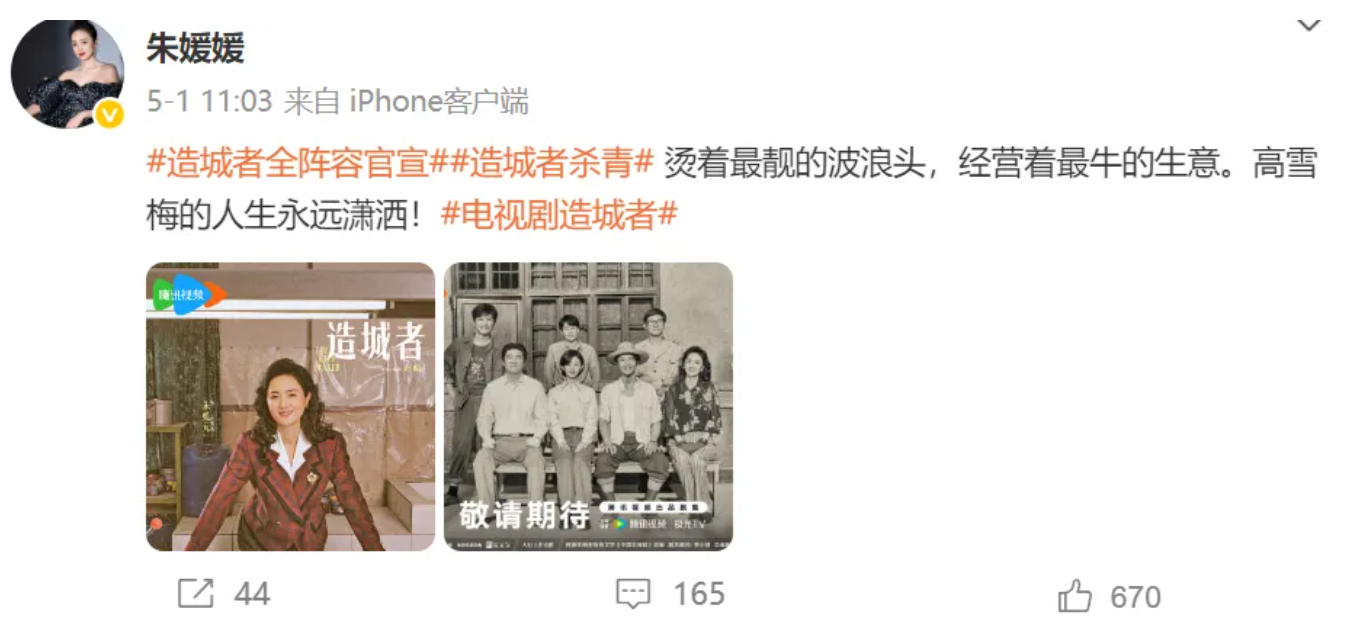 2025年5月1日,朱媛媛在微博分享了新剧《造城者》的角色海报,配文写道:"烫着最靓的波浪头,经营着最牛的生意。高雪梅的人生永远潇洒!"
