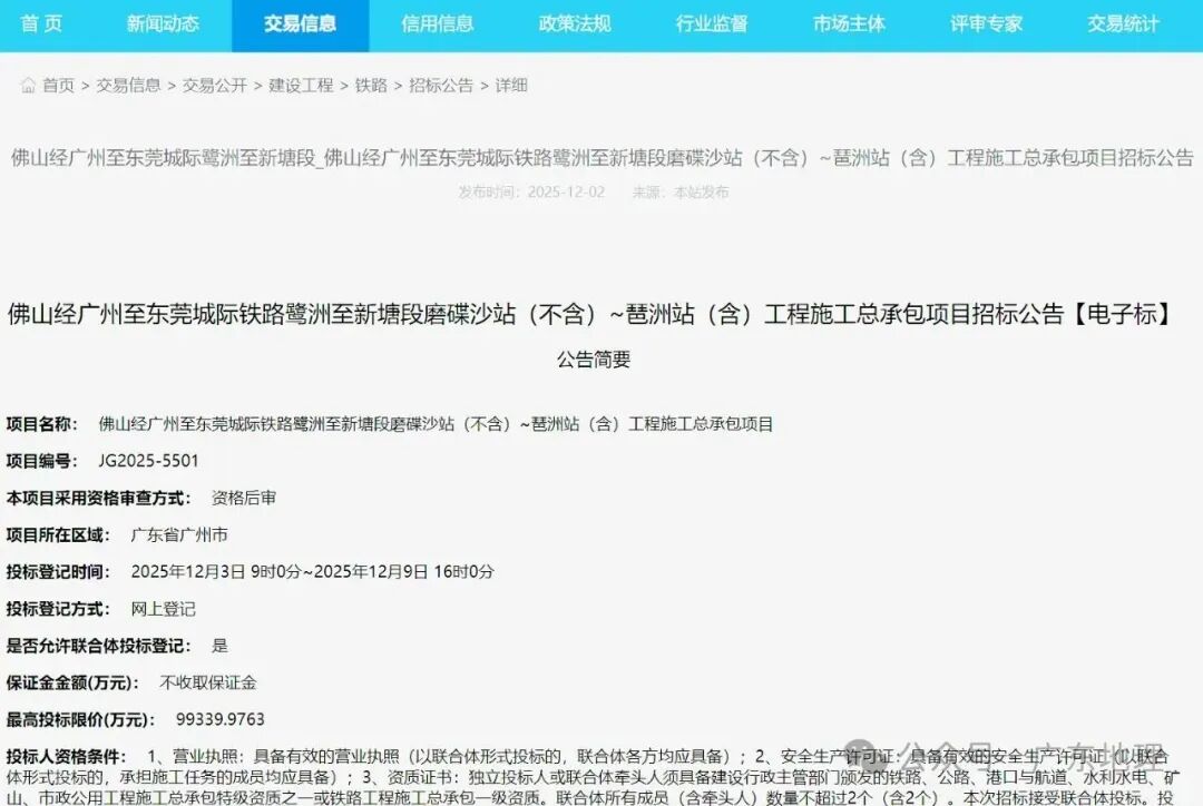其实,早在2025年12月2日,广州公共资源交易公共服务平台发布《佛穗莞城际磨碟沙站~琶洲站工程施工总承包项目招标公告》,意味着这一小段将率先动工,虽然不足10亿元投入,这也是4年来佛穗莞城际特大动态。
