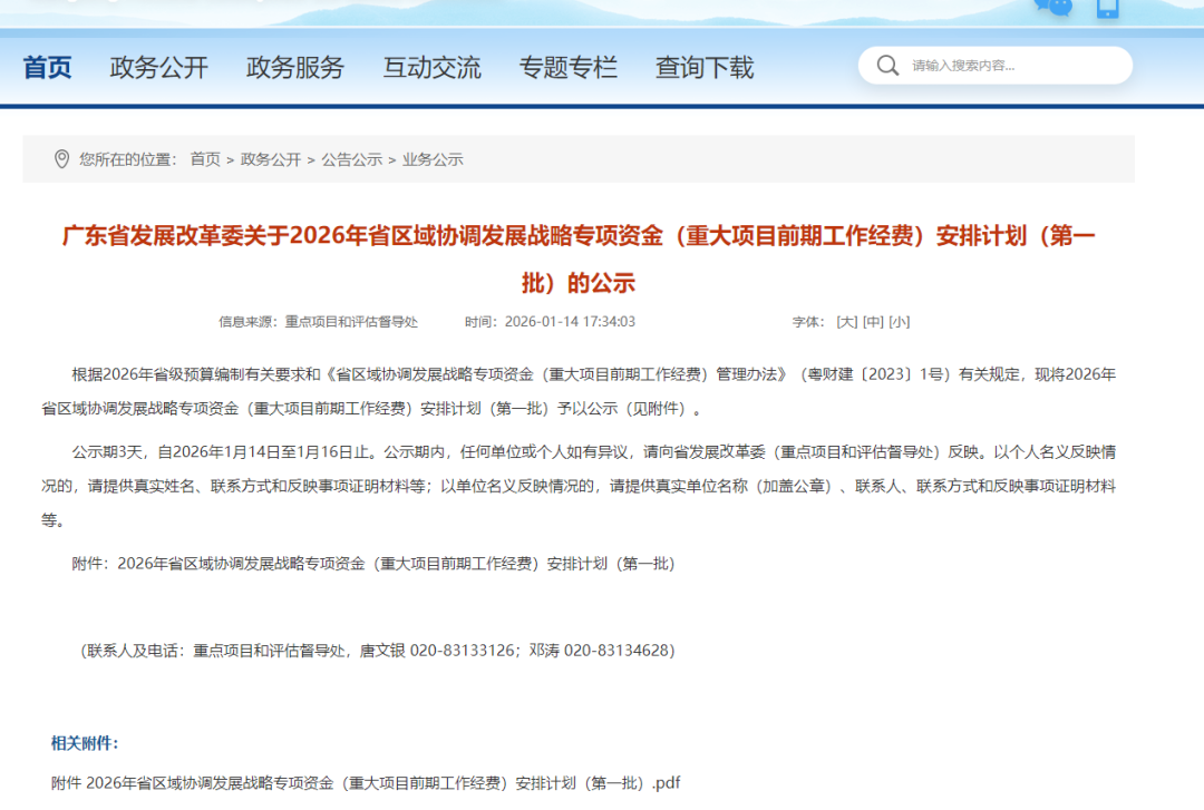 广东省发展改革委关于2026年省区域协调发展战略专项资金(重大项目前期工作经费)安排计划(第一批)的公示。