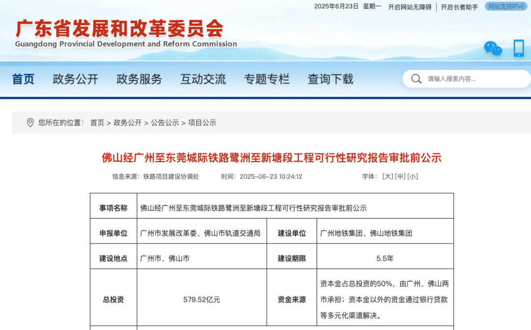 根据广东省发改委发布《佛山经广州至东莞城际铁路鹭洲至新塘段工程可行性研究报告审批前公示》,总投资579.52亿元,建设年限5.5年。