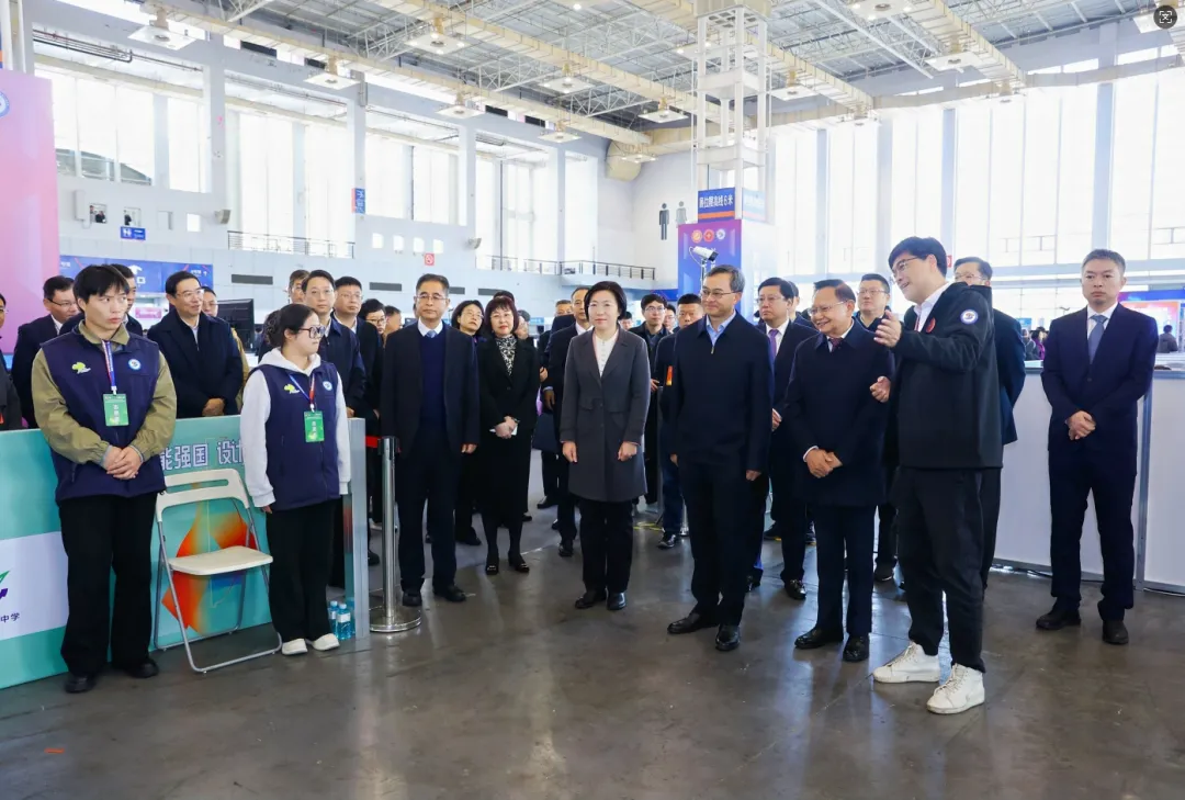 开幕式结束后,颜清辉、张崇和一行还深入赛场进行考察调研。在各赛项赛场,领导们认真听取了赛项专家组组长关于本届赛事核心内容的介绍。专家组组长详细阐述了赛项设立的产业背景与导向,系统说明了考核选手理论素养、创新思维、设计能力与实际问题解决能力的多维指标体系,并具体分析了典型实操样题的设计思路与技能要点。颜清辉尤为关注设计成果如何走出赛场、服务产业,详细询问了往届优秀作品的落地转化情况以及校企合作推动产品孵化的具体路径,并勉励选手坚守匠心、锤炼精湛技艺,将个人成长融入服务人民美好生活与推动产业高质量发展的时代潮流中。
