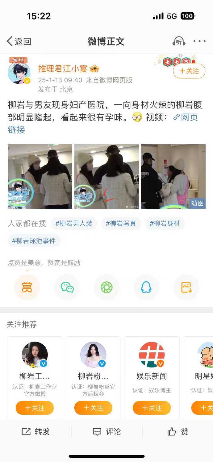 这下子,娱乐圈可谓是炸开了锅,狗仔 “江小宴” 爆料称,柳岩疑似 “知三当三”,在明知男友梁汉君有家室的情况下,与其展开恋情,并逼迫梁汉君离婚后上位,甚至还爆料柳岩现已怀孕 。此消息一经传出,瞬间登上各大社交平台的热搜榜,网友们纷纷展开激烈讨论,柳岩也因此被推到了舆论的风口浪尖。