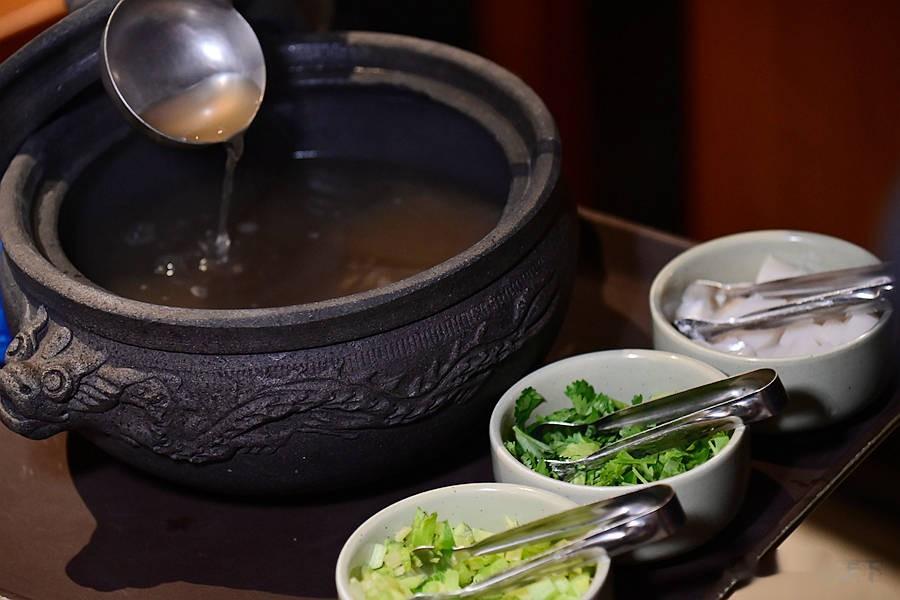 开锅高汤,古色古香的大鼎,一开盖就香气四溢,先喝一碗热气腾腾香浓醇厚的高汤,无比舒畅。
