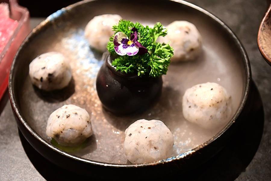 黑松露马苏里拉芝士虾滑,虾滑的鲜美、黑松露的香浓、芝士的香甜融合在一起,拉丝超满足!