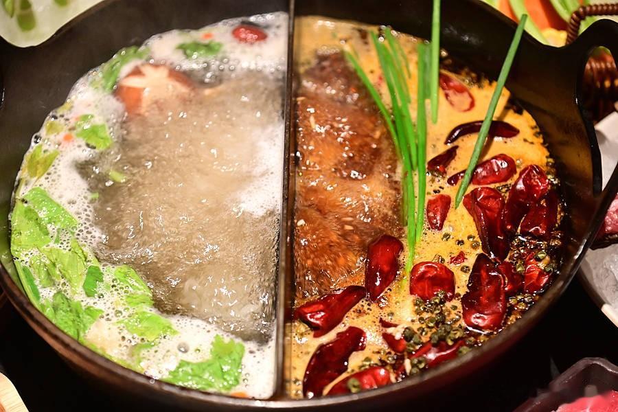 非遗双汤锅,一边是草本原汤,汤方传承四代一百多年,牛骨、牛腱、牛舌、牛蹄筋和十几味草本植物精心熬制,滋补润肺,一边是家传红汤锅,加入老鹰茶做汤底,香辣不燥越煮越香,养生和重口党都满足~