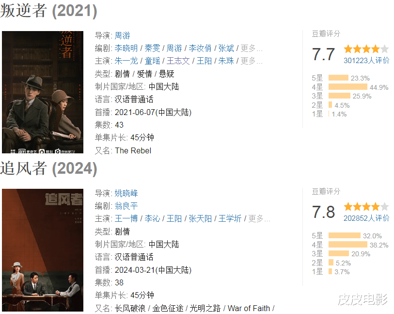 《叛逆者》是朱一龙+童谣+王阳+王志文,《追风者》是王一博+李沁+王阳+王学圻。