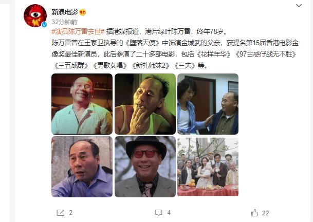 “绿叶王”陈万雷去世,一路走好! 在1月12日娱乐圈再次传来悲痛消息,具有“绿叶王”之称的陈万雷不幸去世,终年78岁。大家知道后纷纷发文哀悼,一生饰演了很多电影,代表作有《堕落天使》、《花样年华》、《97古惑仔战无不胜》、《三五成群》、《男歌女唱》等等。可以说给观众和影迷留下了深刻的印象,除此之外他还在《新扎师妹2》中扮演的“阿七”笑料十足,希望老戏骨一路走好!