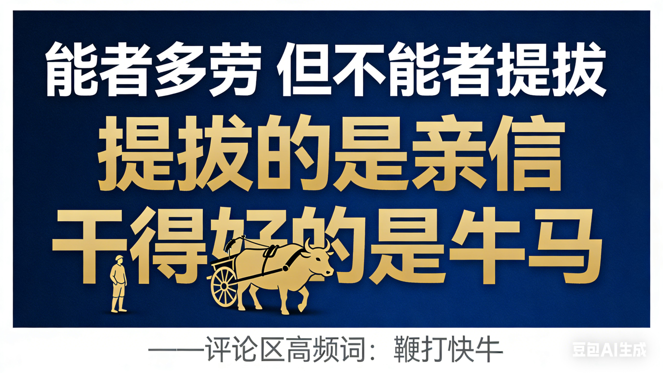 评论区有个词高频出现:鞭打快牛。什么叫鞭打快牛?就是越能干的牛,越要使劲抽它,因为它拉得多、跑得快。而那些懒牛、慢牛,反而可以悠闲地吃草,没人管。职场里一模一样。你越能干,领导越舍不得放你走。你走了,谁来干活?那些费力不讨好、没人愿意接的硬骨头,全得你啃。而那些轻松露脸、容易出成绩的活儿,往往轮不到你。有位工作40年的老前辈留言:> “我工作了40年,遇到的大多数领导,整天围在身边的人,就是会说会捧会做表面工作的人。而工作干得好的人,一般是不会去领导身边混脸熟的,他们也不屑这样做。所以,干得好的人,不一定会得到提拔。”有人总结得更扎心:提拔的是亲信,干得好的是牛马。牛马干得越好,越要使劲用,因为好用。亲信干不干得好不重要,重要的是“是自己人”。---