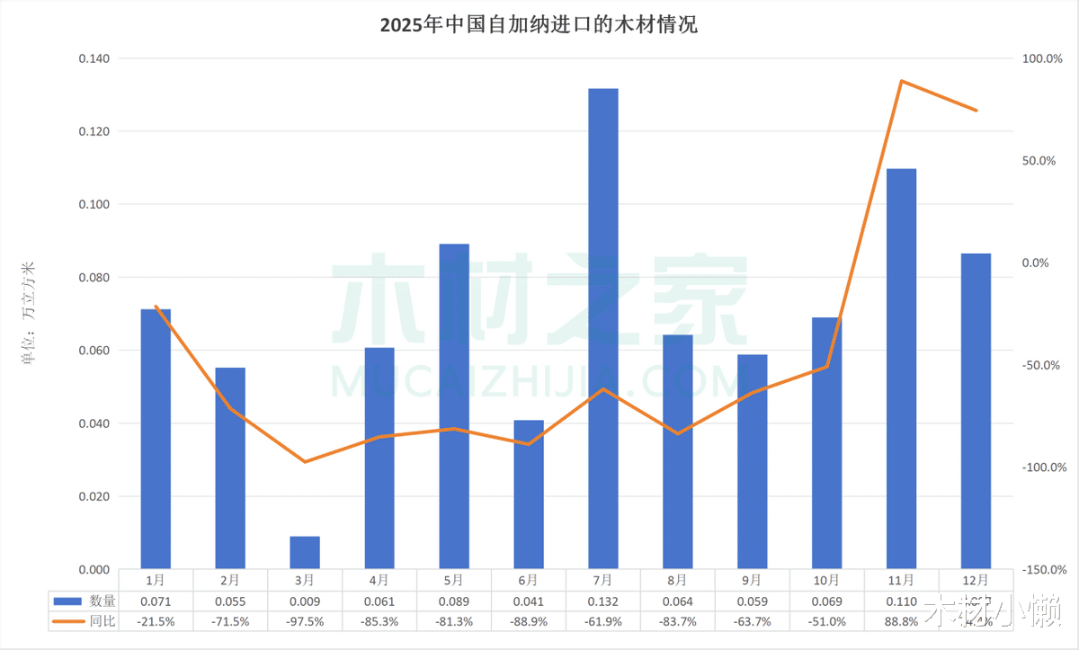从月度数据来看,2025年上半年进口量普遍低于2024年同期,尤其是3月仅进口0.009万立方米,同比下降97.5%,为全年最低点。但值得注意的是,11月和12月的进口量显示出年末回暖迹象,分别为0.11万和0.087万立方米,同比分别增长88.8%和74.4%。