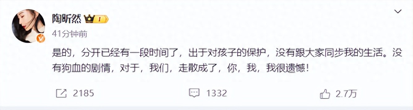 陶昕然的离婚声明坦诚而直接,赢得了网友们的理解和祝福。