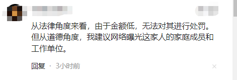 也有位网友认为,从法律角度看,由于金额低,无法对其进行处罚,但从道德角度,他建议曝光这家人的家庭成员和工作单位。