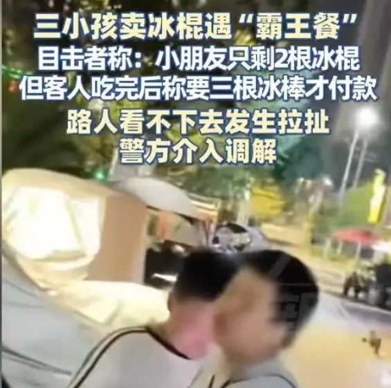 要是一般的孩子碰上这种无赖,那他们可能会选择事情到此为止,然而卖雪糕的这三位小孩也很硬气,为了维护自身的合法权益,决定报警求助。然而令人没想到的是,民警的到来并未让这群成年人意识到自己行为的错误,他们依旧蛮横嚣张,要求三位小孩拿出第三支雪糕,不然就不付钱。
