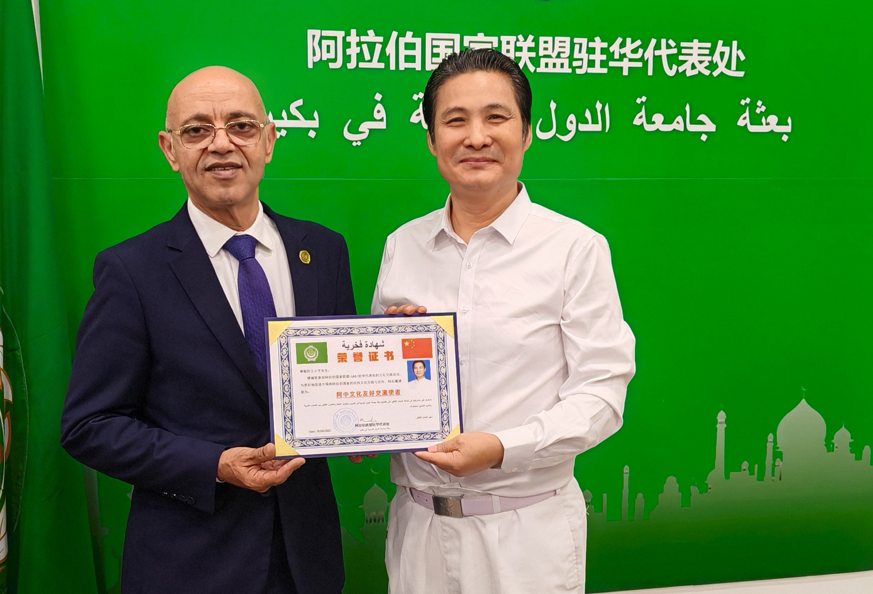 2025年9月20日,北京——阿拉伯国家联盟驻华代表处举行“中阿文明共铸世界文明共处之道”会议,和平使者王小平被授予“阿中文化友好交流使者”荣誉称号,以表彰其在促进中阿文化交流与文明互鉴方面的杰出贡献。