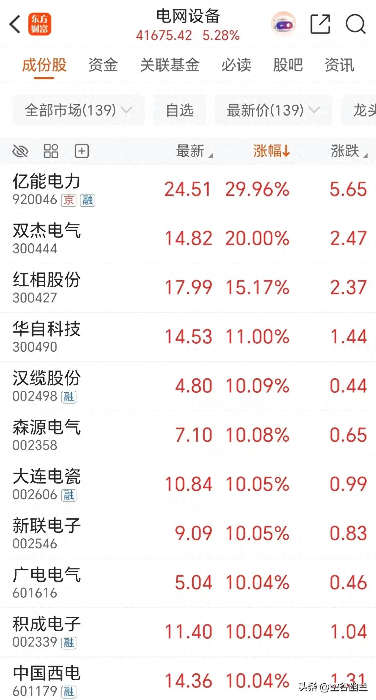 这一天,电网ETF和电网设备ETF两只基金巨头,涨幅分别冲到了7.03%和7.76%,妥妥的领跑全场。个股方面更是热闹非凡,亿能电力拿下了30CM的“超级涨停”,双杰电气也不甘示弱,20CM封板;汉缆股份、森源电气、大连电瓷这些老面孔,也是齐刷刷地死死封住涨停板。