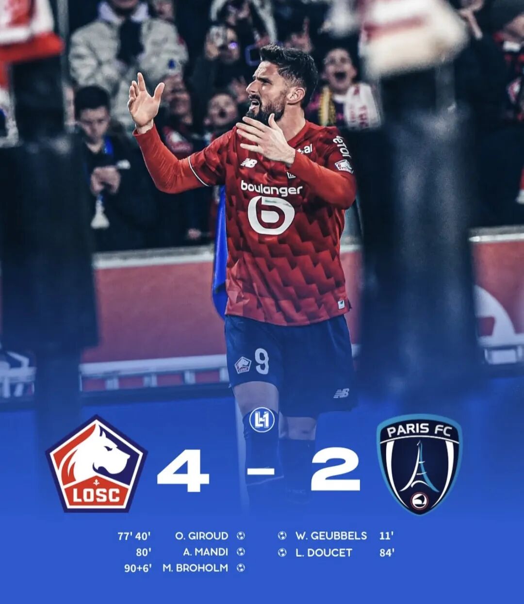 法甲第13轮比赛,吉鲁上演梅开二度,帮助里尔主场4-2击败巴黎FC。