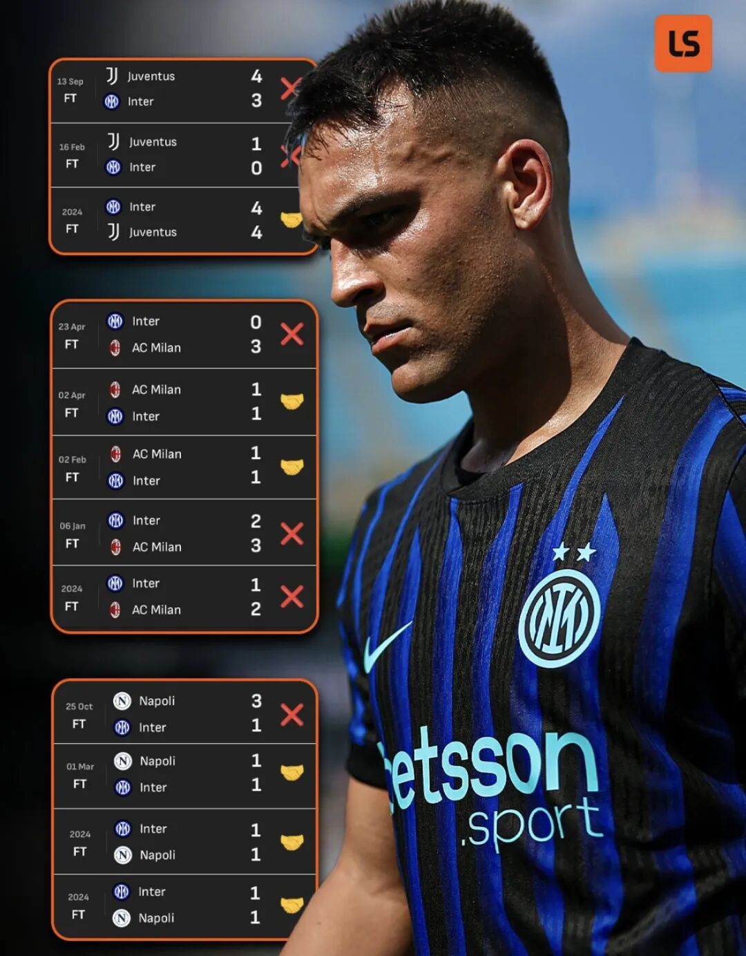 国米上一次在主场赢下米兰德比更是要追溯到2023年9月17日那场5-1的大胜。