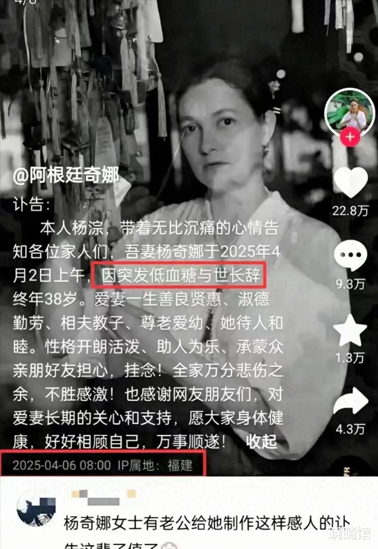 38岁的杨奇娜,一位阿根廷籍华人网红,带着对家庭的无限爱意,突然离开了人世。低血糖,这个看似平常的疾病,夺走了她年轻的生命,也留下三个年幼的孩子和悲痛欲绝的家人。她的离世,不仅仅是家庭的悲剧,也让我们意识到,健康,是多么的珍贵和脆弱。 想想看,有多少人忽视了身体的细微变化?有多少人为了工作、为了生活,透支着健康? 杨奇娜的故事,或许能成为一个警钟,提醒我们关注身体,及时就医,别让遗憾,成为生命中最后的音符。