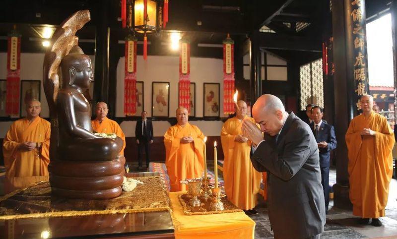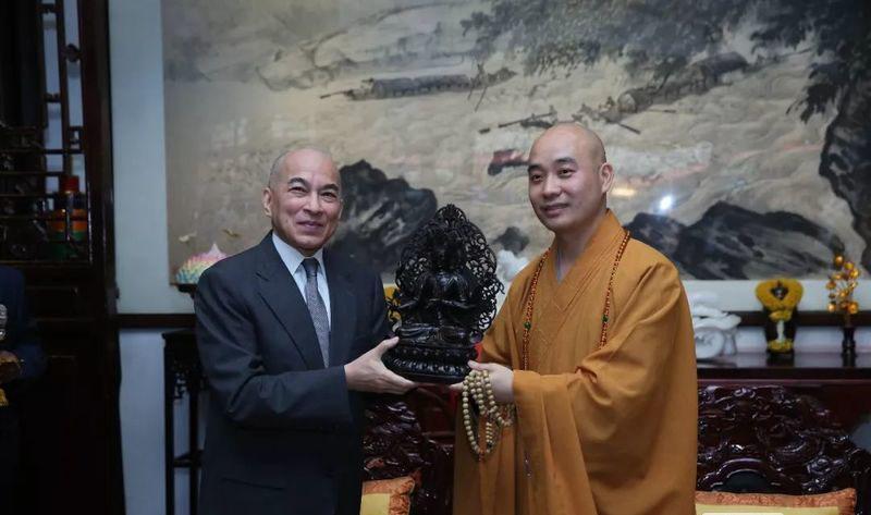 (成都讯)据禅风网报道,9月20日上午,西哈莫尼国王访问成都文殊院,文殊院住持宗性法师率众予以热情接待。 宗性法师向西哈莫尼国王介绍文殊院的历史沿革及古建筑、重要文物。在大雄宝殿,西哈莫尼国王向文殊院赠送了一尊庄严佛像,并虔诚敬香礼佛。随后国王一行瞻仰了佛陀舍利、玄奘法师舍利等。 宗性法师代表文殊院两序大众对西哈莫尼国王一行的到访表示热烈欢迎。 宗性法师说,国王陛下一行在新中国成立70周年大庆前夕来到文殊院访问,令我们感到十分荣幸,国王向文殊院赠送的佛像,将成为中柬人民友好的象征,文殊院将永久供奉,我们十分感谢。 宗性法师祝福柬埔寨在西哈莫尼国王的治理下,国家更加繁荣富强,佛教事业更加兴盛,人民更加幸福安康,中柬两国世代友好;并分别向国王及太后致以诚挚的祝福。 西哈莫尼国王感谢宗性法师及文殊院僧众的欢迎,他希望并相信此次到访文殊院,有助于推动与中国佛教界、四川佛教界及文殊院的交流与合作。 他对文殊院在保护寺院文物与古迹的努力上表示了高度赞赏。最后,他祝愿文殊院在未来取得更大的成就,祝福两国传统友谊日久弥新。 临别时,国王表示,此次文殊院之行,非常喜悦,并且终身难忘。