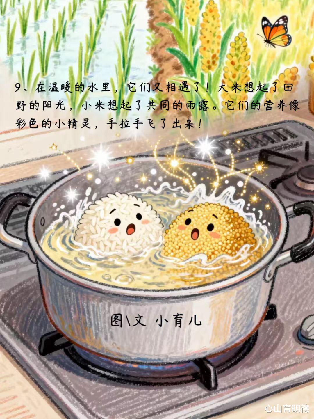 厨房里的延伸:读完后,家长可以和孩子一起动手淘米、煮一锅“二米粥”,将故事魔法变成现实。