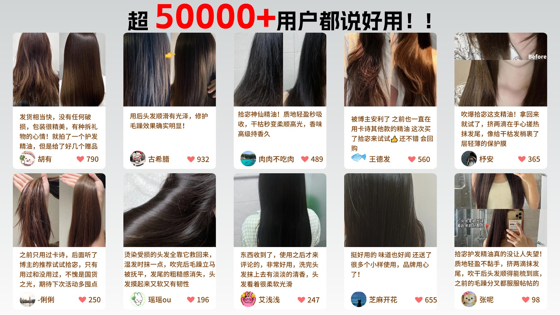 现在市场上有很多劣质护发精油,不仅没效果、使用后肤感油腻还容易伤头皮。拾宓护发精油则没有这些烦人问题,它不仅安全有效,不伤头皮,而且它定位高端沙龙级,香味清新好闻,使用后清爽不油腻,头发柔顺有光泽。特别是秋冬季节,能改善起静电和干枯问题,还能减少分叉、打结和掉发,对烫染发质和沙发特别友好。用完之后整个人的气质都变得更好,体验完全不输800+希思黎护发精油,是我最近的心头好。
