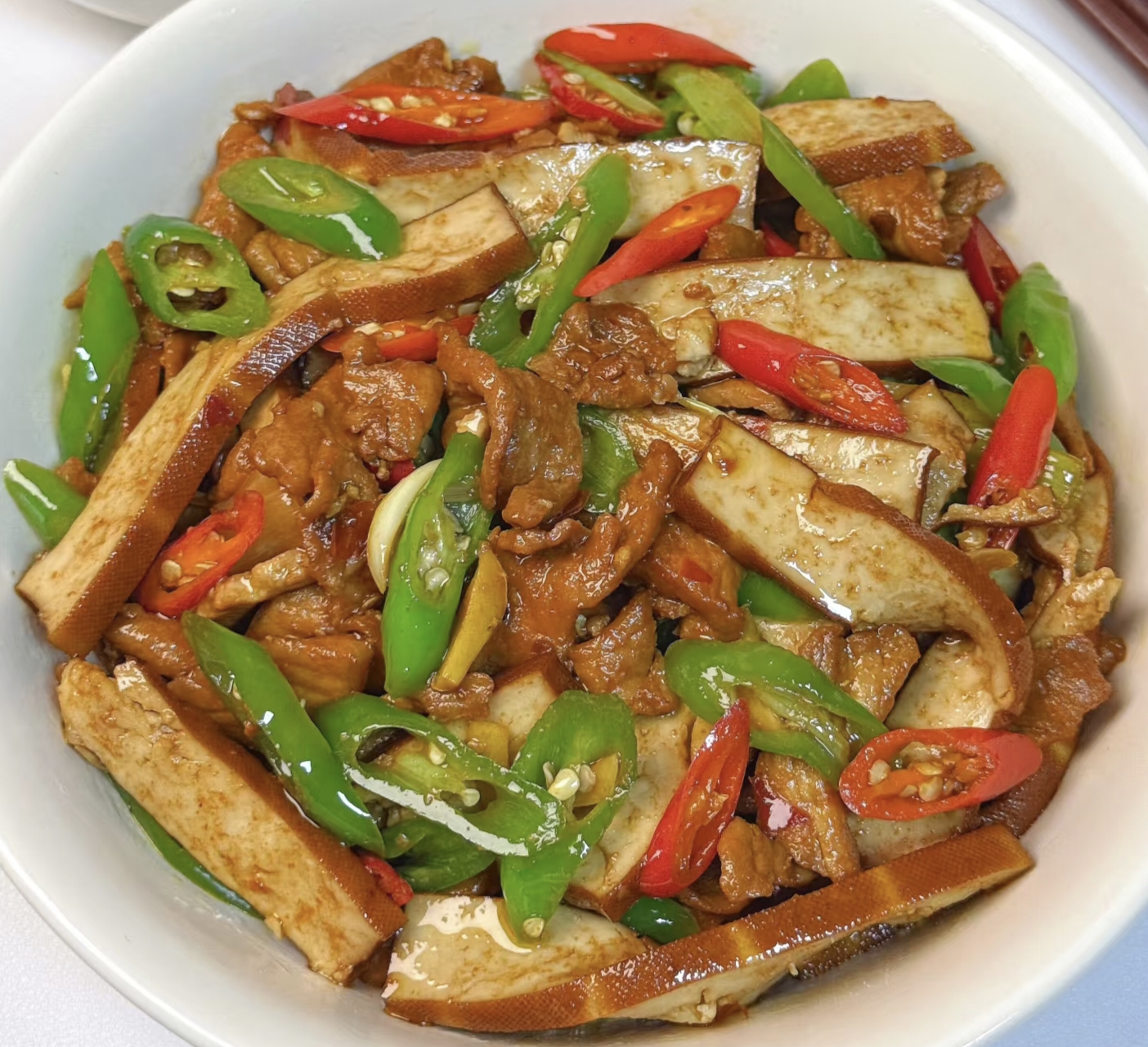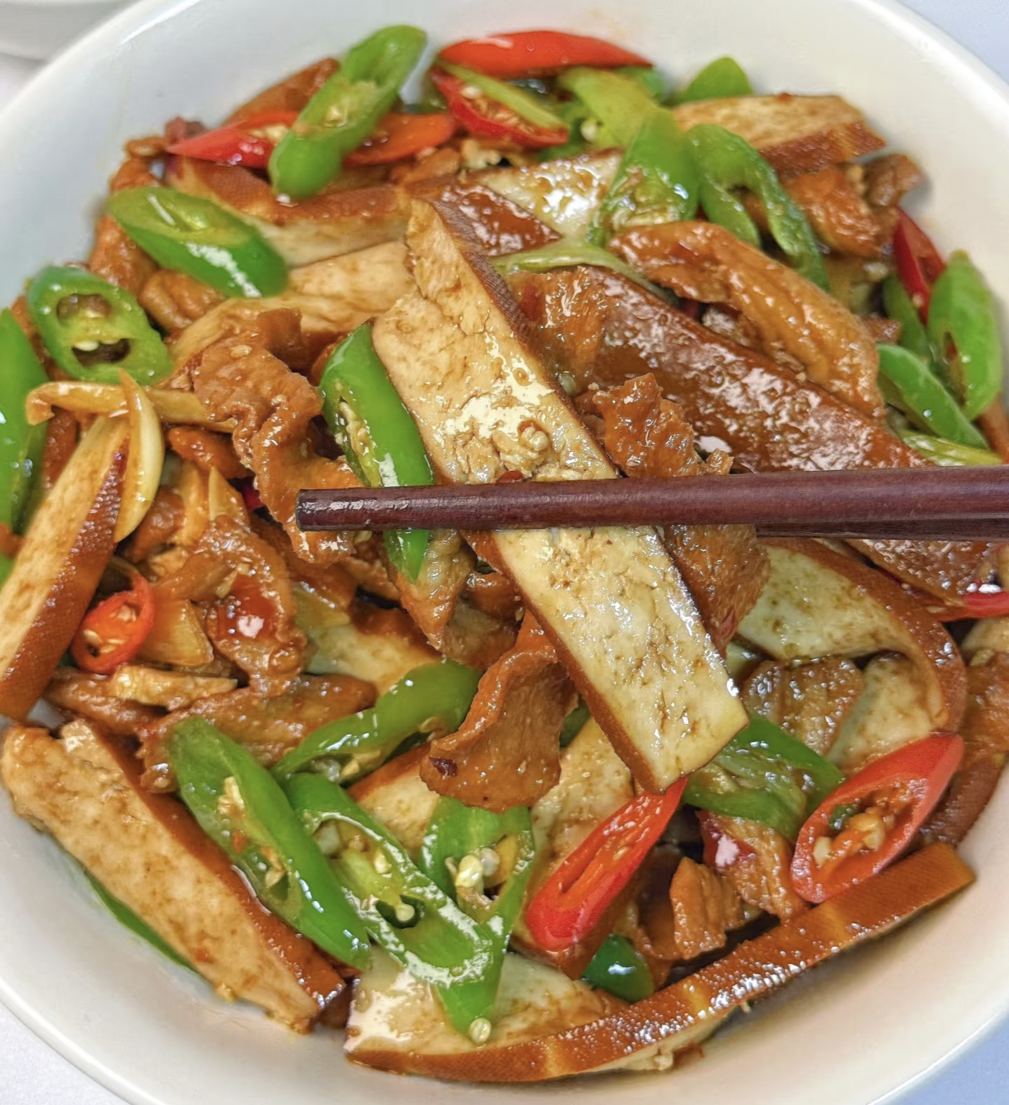 记得小时候,妈妈总在周末做这道菜。她切香干时总把边角料塞进我嘴里,熏过的豆干带着独特的焦香,在口腔里炸开成一朵小花。那时候的猪肉要肥些,煸出的油多到能再炒个青菜。大学住校时,这道菜成了我的"思乡药"。有次视频通话,妈妈隔着屏幕指挥:"先炒肉!火别太大!香干要最后放!"结果我手忙脚乱把锅柄都炒掉了,却炒出了人生第一盘能下三碗饭的香干肉片。