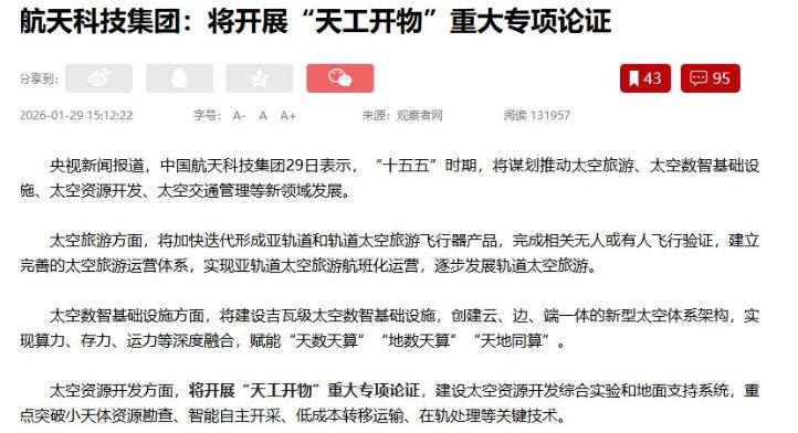 2026年1月29日,中国航天科技集团搞了个大动作,宣布正式启动“天工开物”太空采矿专项论证。