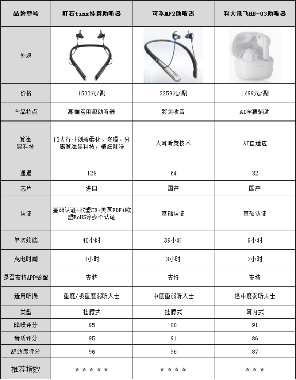 测评结果:町石>可孚>科大讯飞町石助听器音质测评表现:佩戴起来很顺手,整体音质很自然,清晰度、真实度和细腻度都很到位。在办公室、餐厅或者听轻音乐的时候,人声特别分明,乐器声也有层次感。它用128通道系统加双钕磁铁动铁单元,再配上SCS人声频段8层增益技术,让声音还原挺真实的。实际测试中,人声清晰度比一般同价位提升大约105%,听起来不闷,细节也很丰富,长时间戴也不累耳,整体感受挺顺畅。可孚助听器音质测评表现:整体听感还可以,音质清晰度和真实度都比较稳,细腻度也还行。采用了多段增益和柔化声学处理,办公室或餐厅里人声听起来比较饱满,分离感还过得去。不过高音的细节偶尔会有点平淡,音乐层次感没有町石那么丰富。整体来说,日常对话和轻音乐场景够用,但复杂声场或者长时间听感略显普通。科大讯飞助听器音质测评表现:整体体验一般,中规中矩,清晰度、真实度、细腻度表现都属于中等水平。用了多通道声学处理技术,在办公室和安静餐厅里人声还能辨认清楚,高音和细节层次偏平,音乐低中频也一般。长时间戴会觉得声音缺点立体感,复杂环境下听感不会特别突出,整体调校偏保守,更适合短时佩戴。