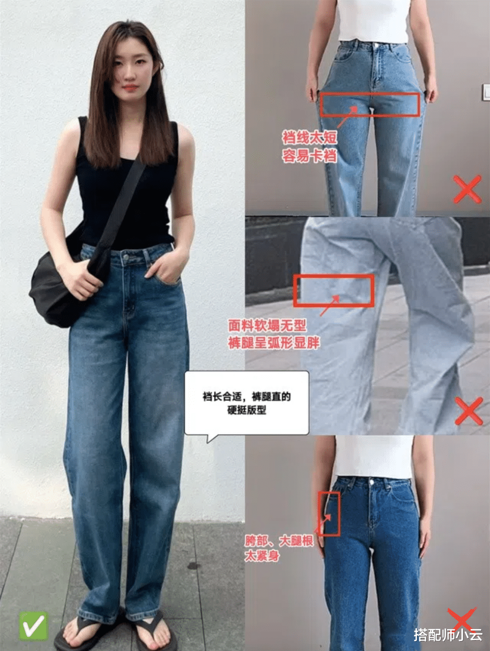 关于阔腿裤的选择,大家选对了就能显瘦显高。对于腿粗腿短的女性来说的话要避开裆线过短、臂部和腿部之间的紧身版型,避免裆线太低容易卡裆,还有就是胯部、大腿根的版型太紧身的话容易造成暴露腿型。最理想的板鞋就是我们选择裆长要合适、H型和直线条的裤腿,配合硬挺不易皱的面料,轻松穿出高级感。