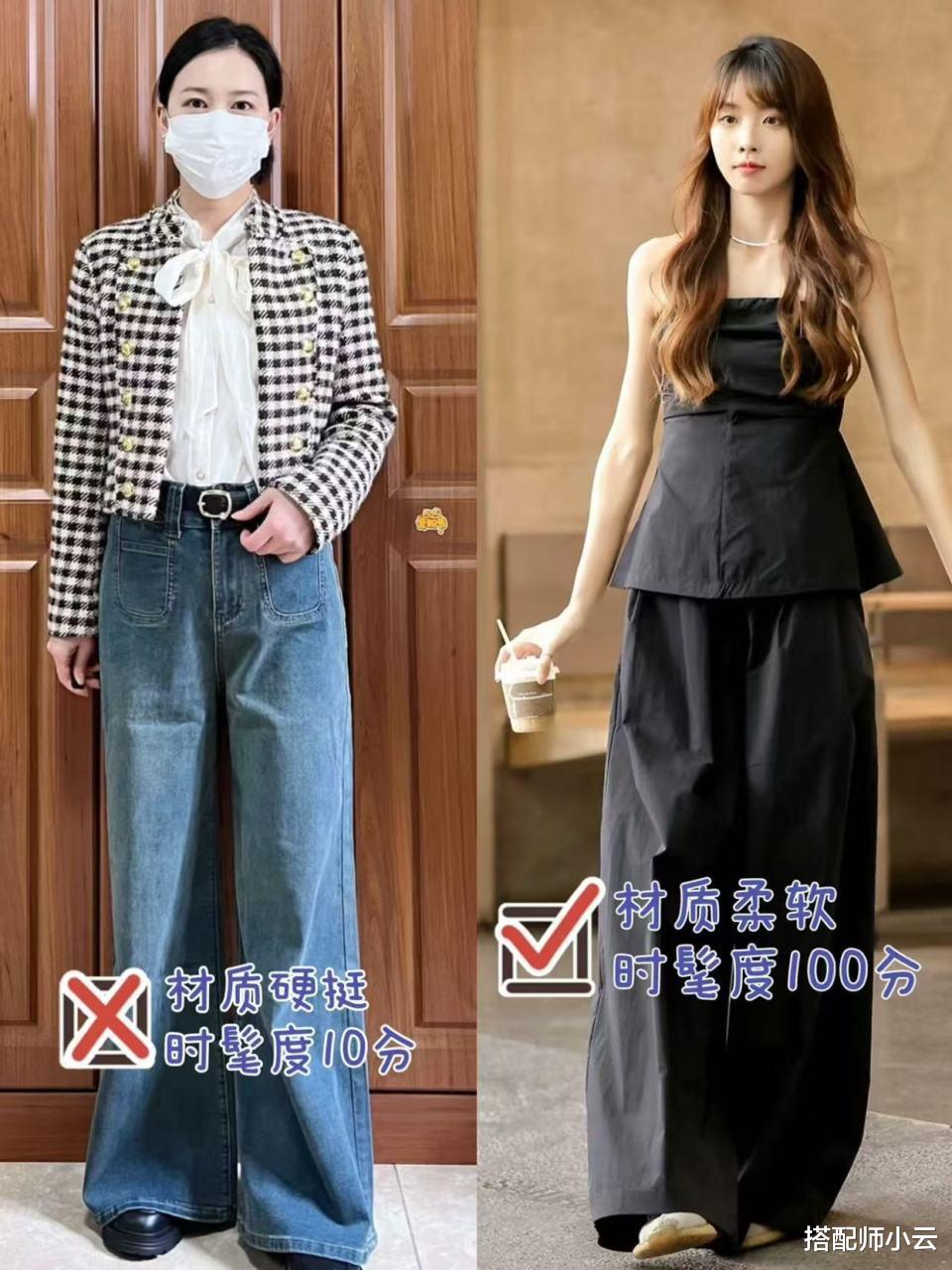此外很多腿粗或者腿型不完美的女生都会选择较为宽松的牛仔裤,但牛仔裤的材质通常岁时比较硬挺,尤其是越宽松的款式反而越有“膨胀感”,穿上的话舒适度较低。反之我们去选择带有垂坠感的裤子,不仅能够很好的修饰腿型,同时还能帮我们削弱腿部的臃肿感,看起来更加的显瘦显高级。