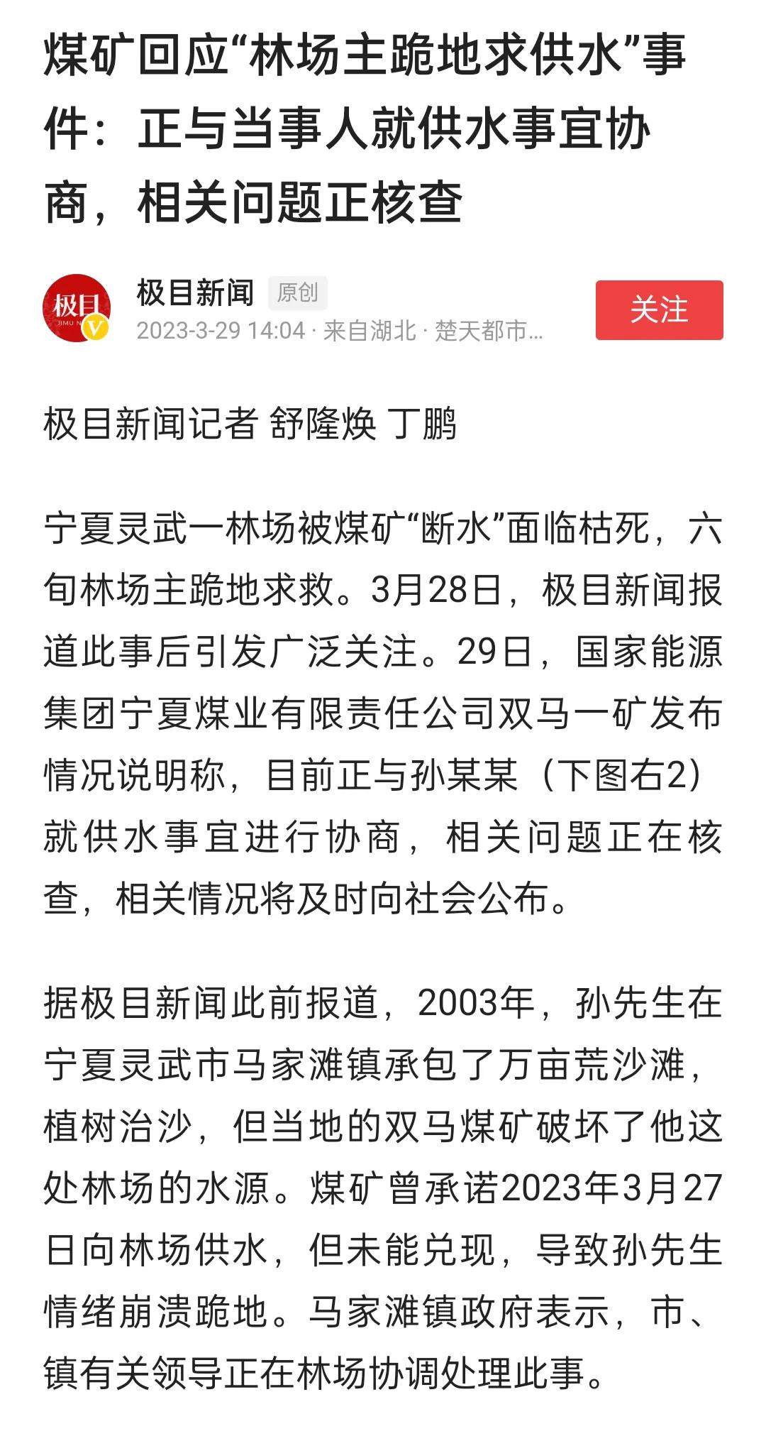 如果“林场主跪地求供水”事件没有媒体的关注,不知道还有没有政府和官员及相关单位出面去沟通解决问题。 据说事主以前是个路桥老板,后来拿出全部身家去大沙漠植树造林,孙姓林场承包人把毕生积蓄和精力投入到治沙植树造林当中,却是这种结果,令人泪目。据说央视曾经报道过他的光荣事迹,但没想到如今落下这个结果。 真正为这个社会默默无闻奉献一生的人,得不到什么回报不说,更可悲的是碰到这种种荒唐事情却无能为力,内心无尽的悲凉和绝望,是对这个社会的心寒。如此一来,还有人愿意去为这个社会愿意无私付出吗?