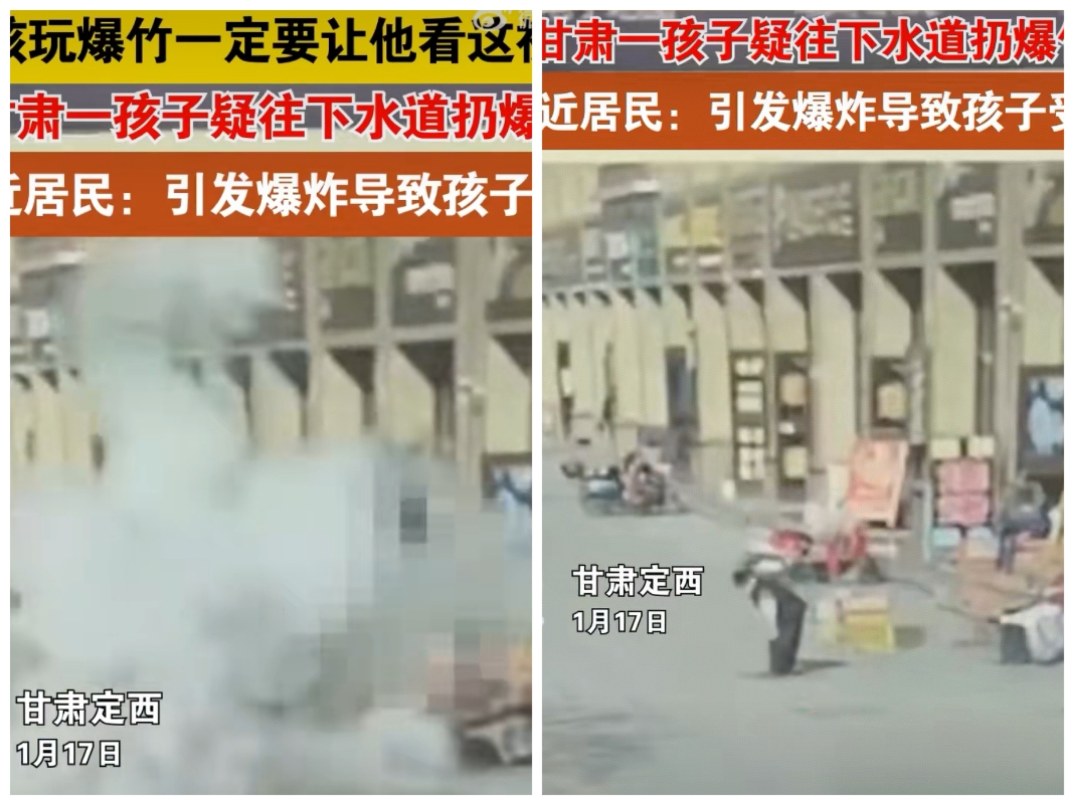 1月18日,“男童点爆竹扔进窨井被炸起数米高”就登上了热搜榜。1月17日,定西临洮县一男童往窨井扔爆竹,引发爆炸。闪爆冲击波将他掀起数米高,窨井周围部分地砖被炸损。男童家属和路过群众合力施救,将受伤男童送往医院。