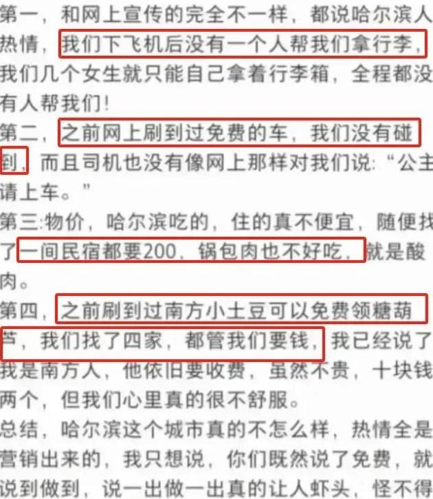 之前,还看到过很多类似的事情,比如“哈尔滨人不帮忙拿行李”“没有免费的车”“民宿要200元,锅包肉不好吃”“冰糖葫芦不免费”,甚至还有投诉不说“公主请上车”的。