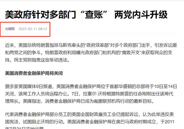 (信源:光明网2025年2月11日—美政府针对多部门“查账” 两党内斗升级)