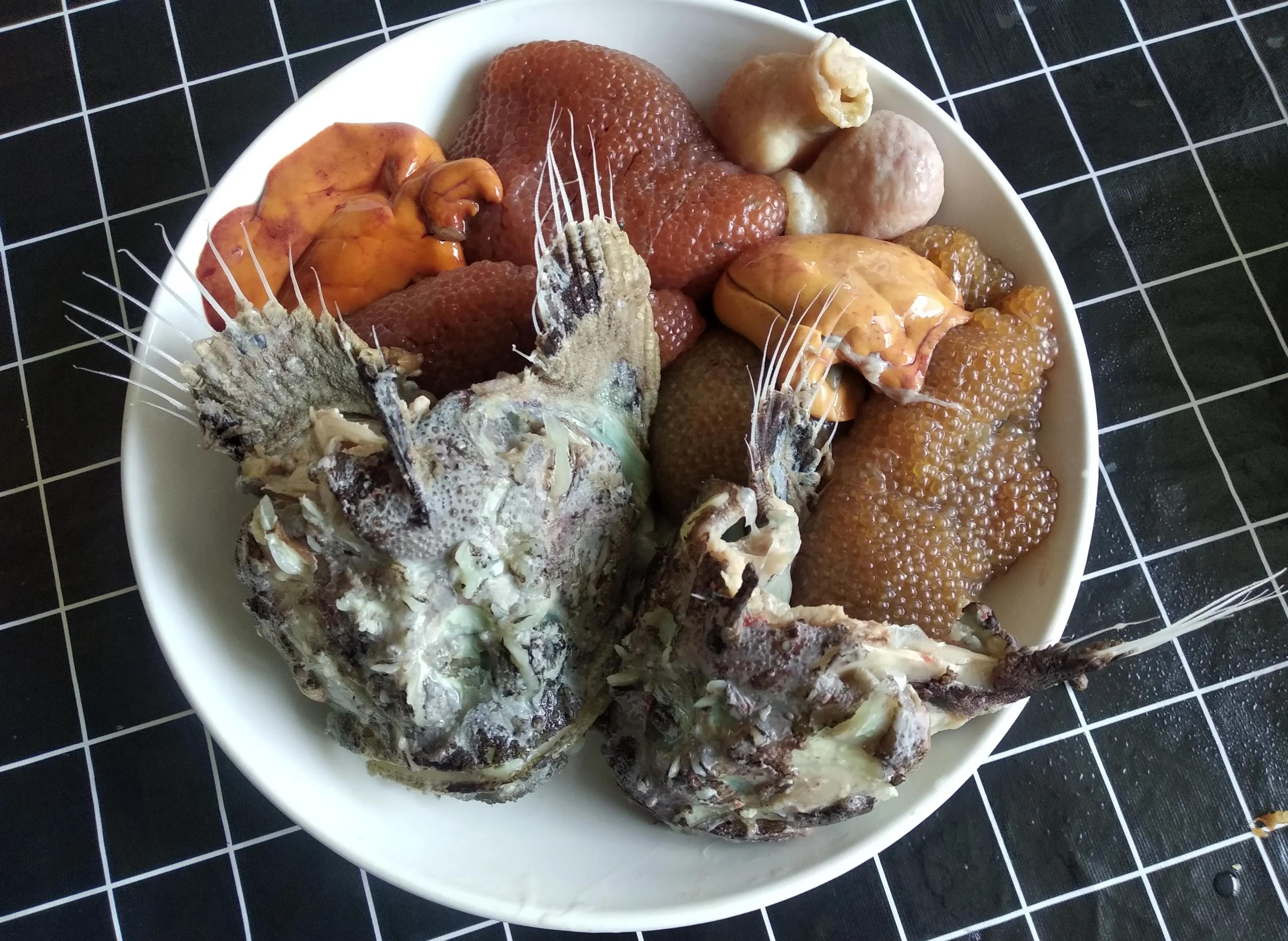 先生鱼和鮟鱇鱼的鱼肚、鱼籽和鱼肝看起来并不美味,但有些人却把它们当作美食。