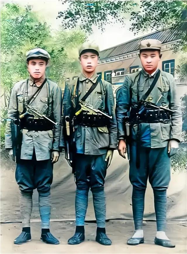 建国初期,三名警卫员在照相馆里拍的一张合影,他们腰佩戴驳壳枪,身姿挺拔,威风凛凛。 这三个年轻战士,左起第一个忠厚,第二个机灵,第三个壮实,别看他们年轻,他们可能经历了长征,抗战和解放战争,是百炼成钢,千里挑一的老兵。