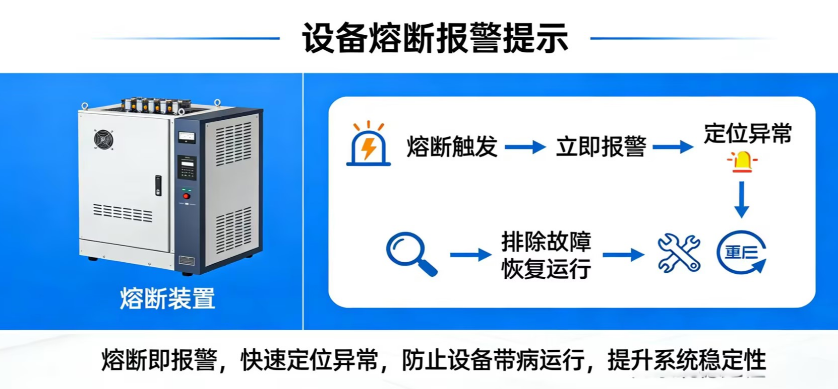 故障提示:熔断即报警,方便快速定位异常,让设备不带病运行,提升系统稳定性。