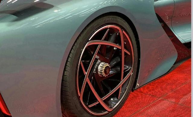 轮辋设计独特,似行星星轨交错,配碳纤维轮毂,彰显极致运动与科技风。红旗logo金边镶嵌,经镜面处理,视觉效果尤为突出。