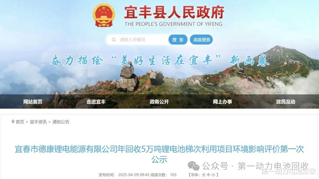 第一动力电池回收消息,近日,江西省宜春市宜丰县人民政府正式发布“宜春市德康锂电能源有限公司年回收5万吨锂电池梯次利用项目”环境影响评价第一次公示,标志着宜丰县在锂电回收领域迈出重要一步。作为宜春市锂电产业布局的关键环节,该项目将通过分阶段建设,实现年回收5万吨废旧锂电池的梯次利用及资源化处理能力,为全国锂电回收产业注入新动能。