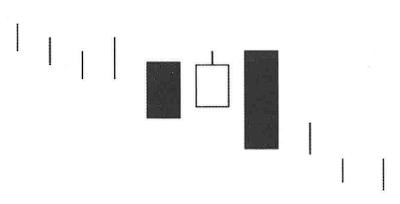 2,下跌强调形态可以存在变形形态,两根阴线之间所夹的K线无论是阴线或阳线,均不影响该形态成立。