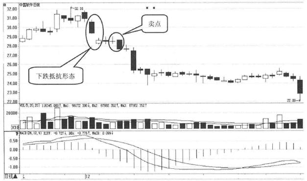 如图2-2所示,处在下跌走势中的中国软件(600536)出现下跌抵抗形态,表明虽然盘中出现反弹,但是反弹的力度很弱,空方依然主导着股价的运行。