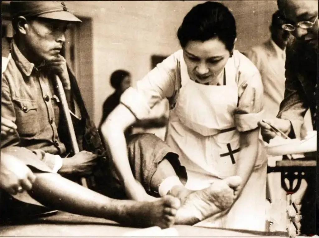 1938年的汉口,宋美龄在医院里为受伤的战士包扎伤口。身为“第一夫人”,她做得尽