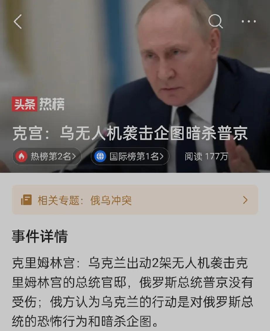 两架无人机袭击了俄总统官邸克里姆林宫,无人机爆炸后现场火光一片。俄罗斯声称这是乌克兰要暗杀普京,但没得逞。乌克兰矢口否认跟乌克兰没关系。 事情太突然,而且直指俄总统,针对性这么强的行动,到底是谁干的?谁敢这么干呢?