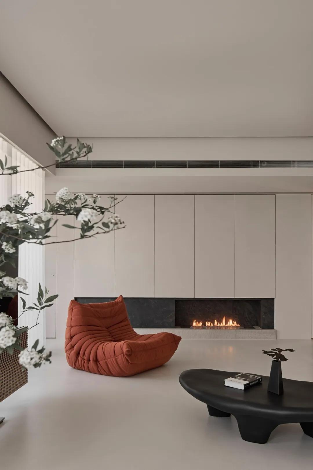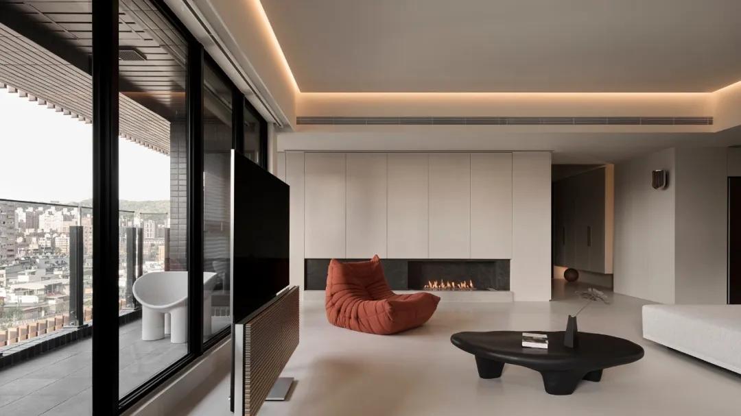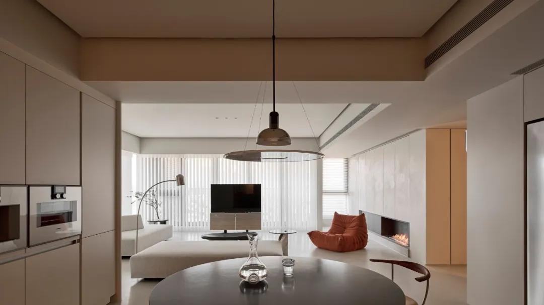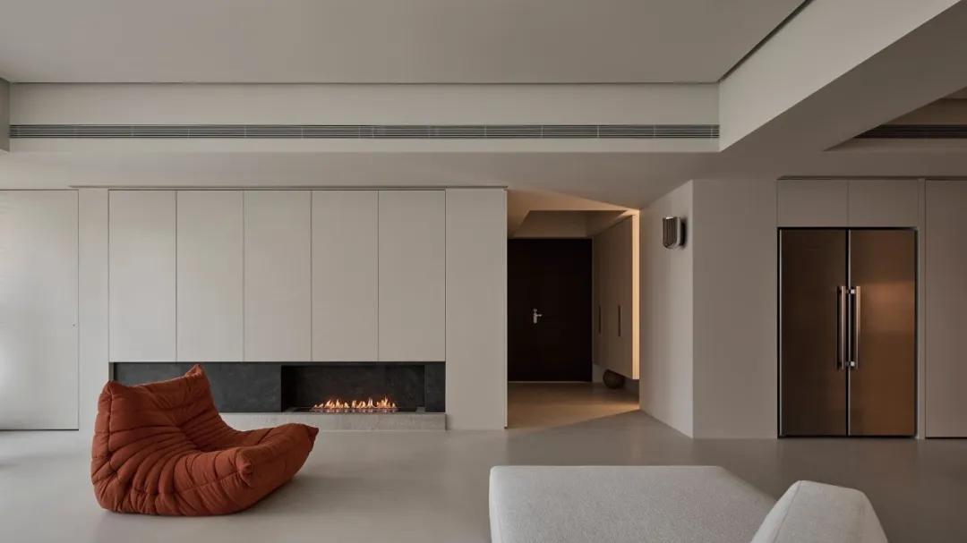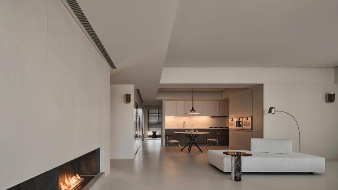 本案整体设计风格为现代简约,强调线条的简洁和空间的开放性。设计中大量使用了中性色调,如白色、米色和灰色,营造出一种宁静和谐的氛围。探索一种无边界的居住空间,模糊了公私领域的界线。透过连续材质、隐藏式收纳与柔和的动线,形塑出空间的自由流动感。线性壁炉作为情感核心,低调地传递温度与安定,而非视觉主角。