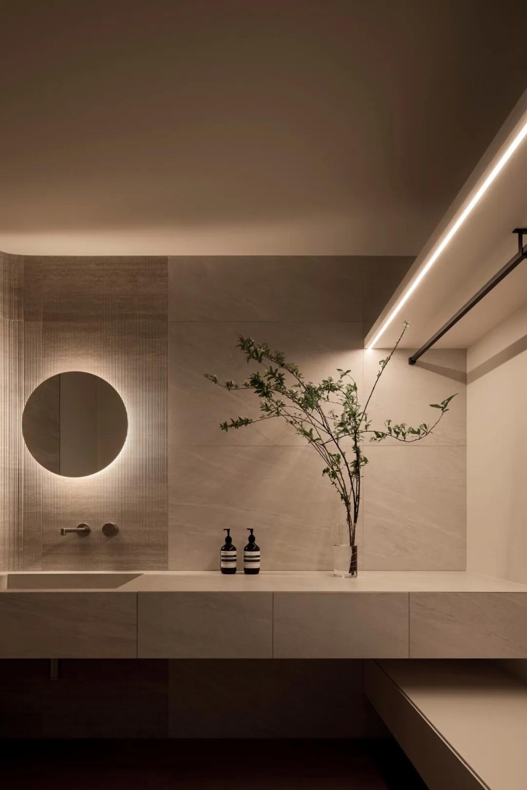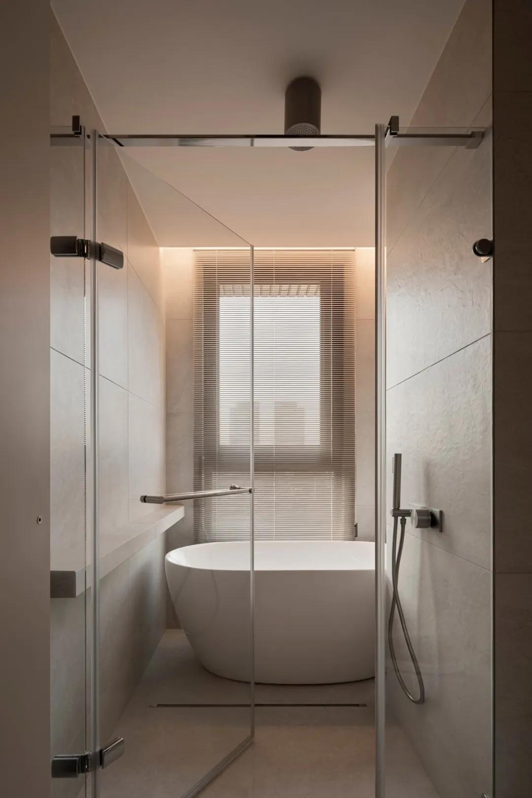 卫生间设计现代,使用了大面积的镜子和嵌入式照明,增加了空间的明亮感。淋浴区和浴缸区域的分离设计,既实用又美观。墙面和地面的材质选择体现了设计师对质感的追求。