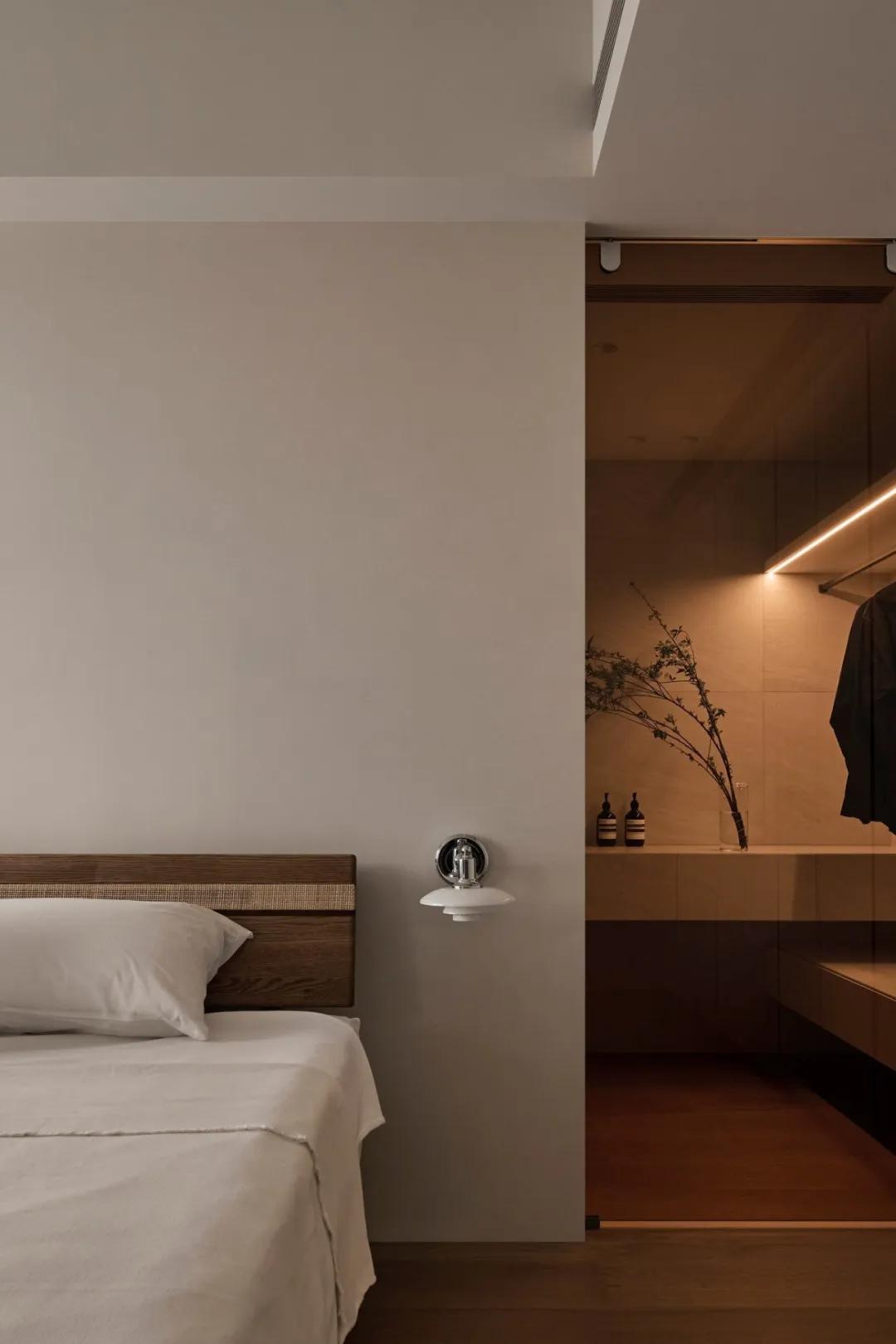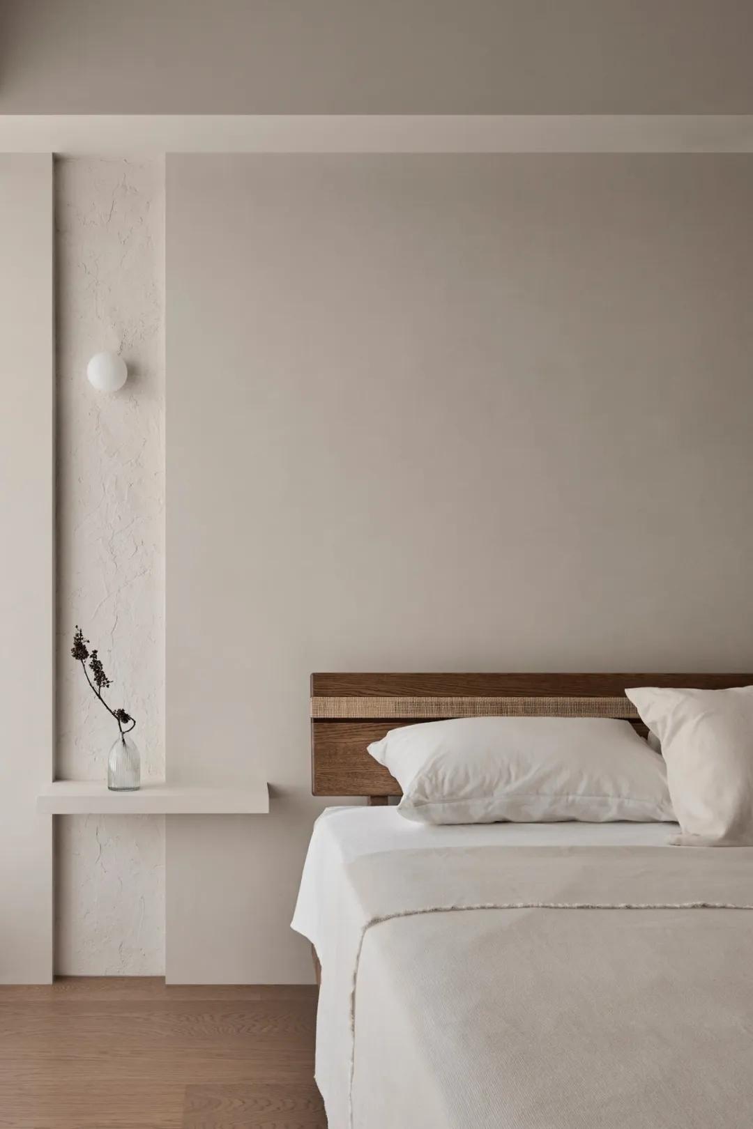 卧室设计注重舒适性和私密性,使用了柔和的灯光和中性色调的床品。床头背景墙的设计简洁,可能使用了木质或软包材料,增加了空间的温馨感。