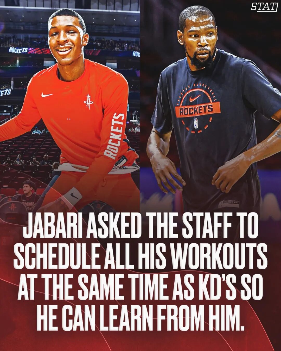 据悉,他找工作人员安排,将自己的训练内容和时间都改成和杜兰特一样,火箭热身期间,经常能看到小贾巴里像个“跟屁虫”一样模仿着杜兰特的一招一式。