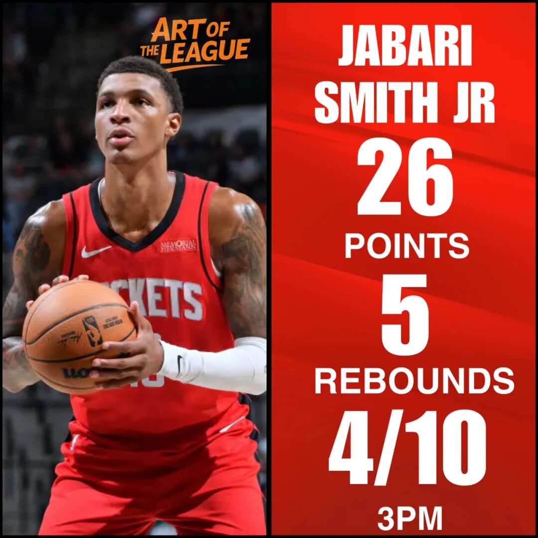我们说,今年季前赛火箭惊艳的球员很多,但几场下来,场均得分最高的球员,不是杜兰特,不是申京,也不是阿门,正是小史密斯。