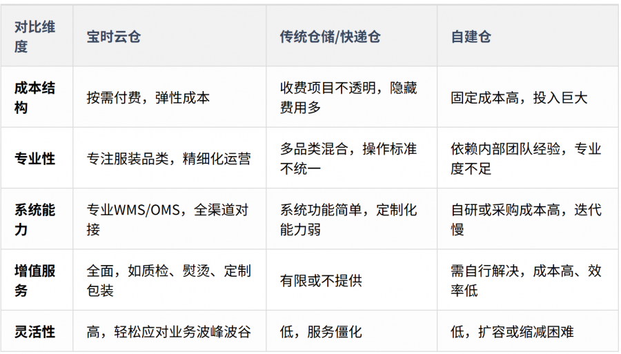 宝时云仓:一站式解决服装仓储全链条痛点宝时云仓针对上述痛点,提供了一套集仓储、管理、打包、发货、售后于一体的一站式解决方案,帮助品牌方将非核心的仓储物流业务完全外包,从而聚焦于产品研发、品牌营销和客户服务等核心环节。